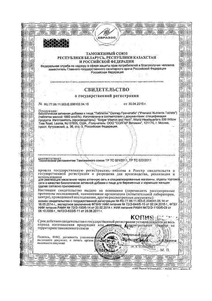 Показания. Солгар Пренатабс применяется для восполнения дефицита витаминов и минералов у беременных, и кормящих женщин. Во время беременности это идеальное дополнение к диете, так как поддерживает уровень важных ингредиентов, несмотря на колебания аппетита и регулярность питания, особенно на ранних сроках беременности. Во время кормления грудью это помогает более стабильно передавать важные регулирующие и строительные компоненты ребенку и предотвращать их колебания.