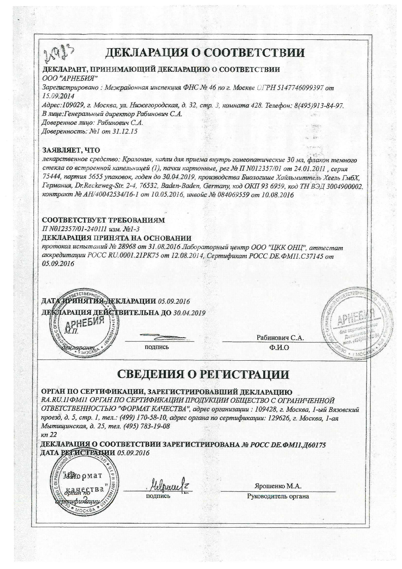 Применение. Кралонин предназначен для перорального применения за 15–20 минут до или через 1 час после приема пищи. Перед применением капли следует растворить в 10 мл питьевой воды. С целью профилактики взрослым пациентам и детям с 12 лет назначают по 10 капель раствора 3 р./сутки. В остром периоде капли используют в течение 2-х часов по 10 капель каждые 15 минут. Продолжительность терапии – от 14 до 21 дня.