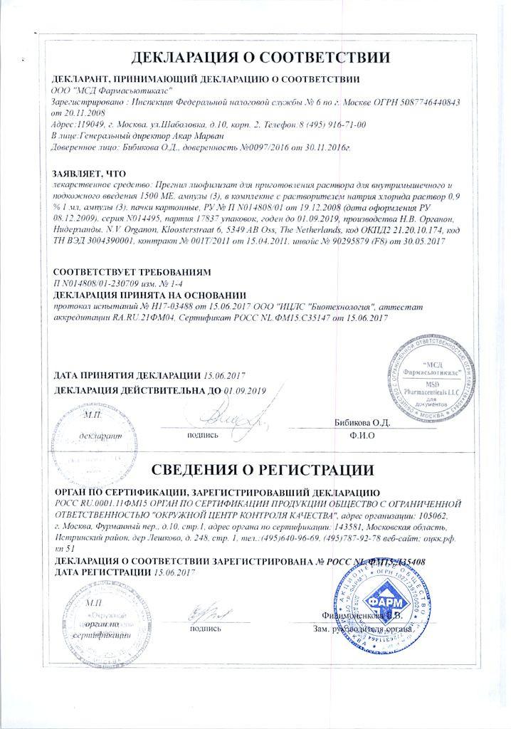 Прегнил - лиофилизат для приготовления раствора для внутримышечного и подкожного введения 1500 и 5000 ME в комплекте с растворителем (натрия хлорида раствор 0,9%).