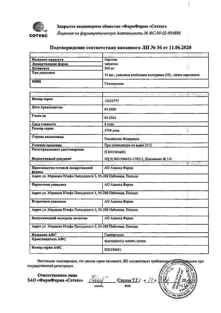 Форма выпуска, упаковка и состав препарата Одестон