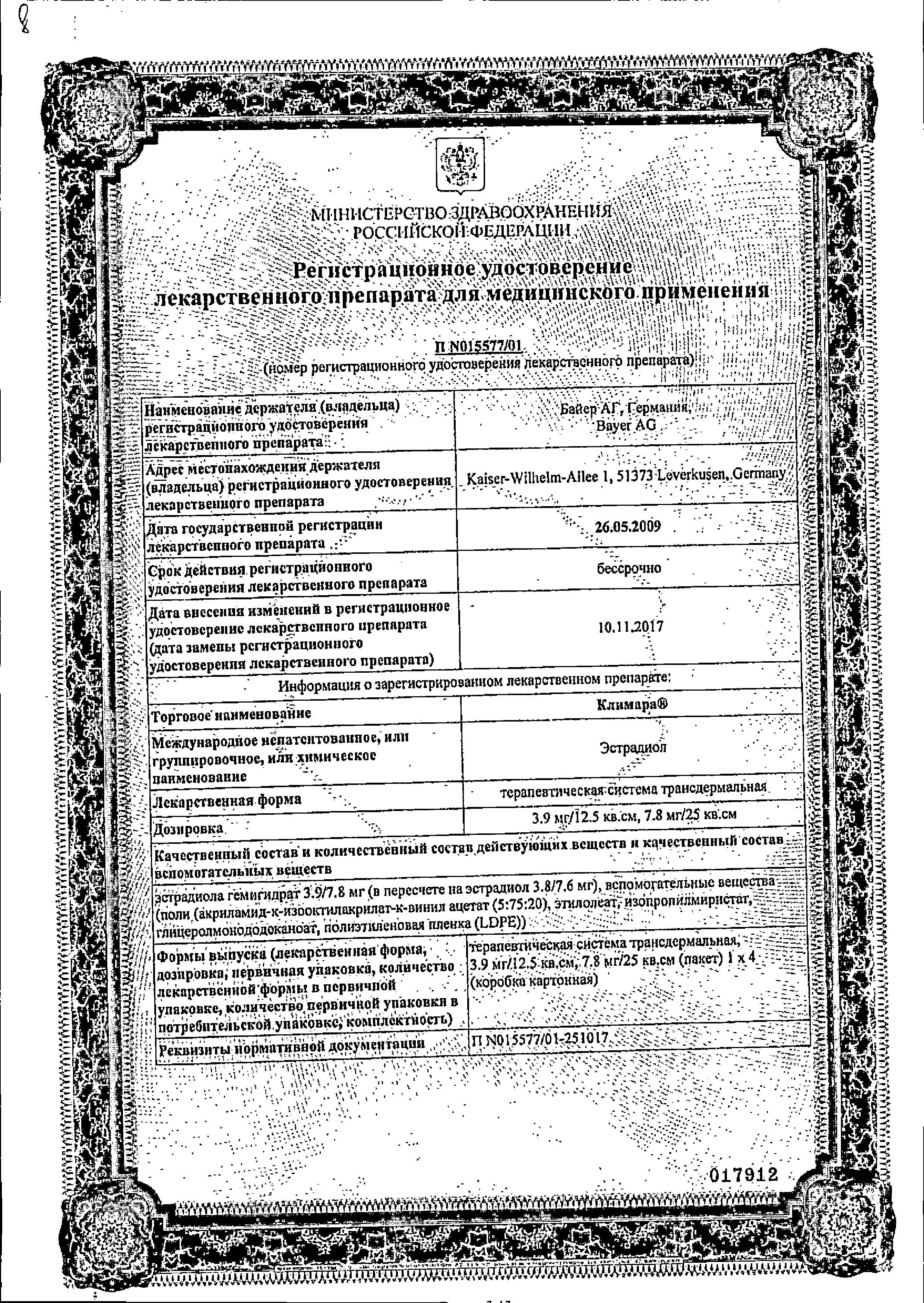Climara доступна в форме пластыря площадью 12,5 см2. Каждый пластырь площадью 12,5 см2 содержит 3,8 мг эстрадиола (эквивалентно 3,9 мг полугидрата эстрадиола) с номинальным высвобождением 50 мкг в течение 24 часов. Эстрадиол, активный ингредиент CLIMARA, принадлежит к группе гормонов, называемых эстрогенами. Эстроген является основным женским половым гормоном, обеспечивающим женские характеристики, в том числе менструальный цикл. Каждая упаковка содержит 4 пластыря овальной формы.