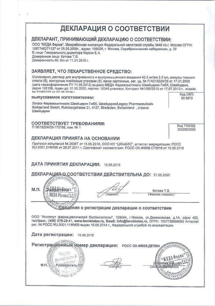 1 ампула содержит депротеинизированный диализат из крови здоровых молочных телят (в пересчете на сухое вещество) 42,5 мг.