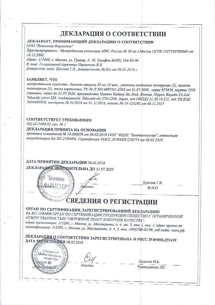 Ластет - капсулы по 25 мг, 50 мг и 100 мг. По 10 капсул в блистерах. По 1 блистеру с капсулами по 100 мг, или по 2 блистера с капсулами по 50 мг, или по 4 блистера с капсулами по 25 мг в картонной коробке с инструкцией по применению.