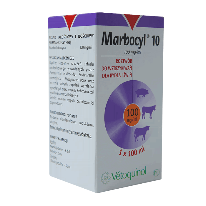 Свиньи: лечение животных, больных синдромом ММА (метрит-мастит-агалактия), а также при заболеваниях органов дыхания, которые вызваны Actinobacillus pleuropneumoniae, Mycoplasma hyopneumoniae, Pasteurella multocida, чувствительными к марбофлоксацину.